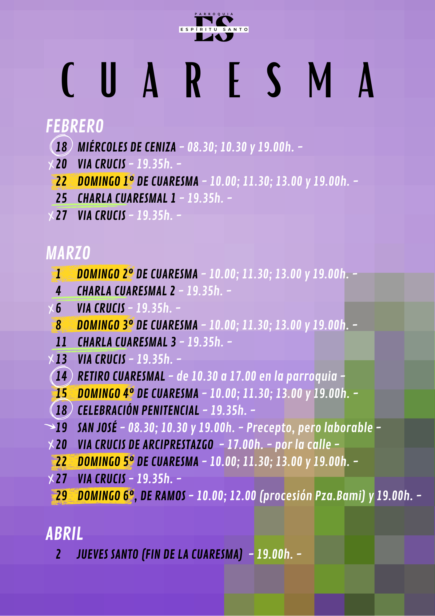 Se acerca la semana grande de la liturgia católica, la Semana Santa. En estos enlaces puedes ver los detalles de cada uno de los días más importantes: Domingo de Ramos , Jueves Santo , Viernes Santo , Sábado Santo Domingo de Resurrección . En el cartel de la siguiente imagen te dejamos el todos los horarios para que los puedas ver de un vistazo: