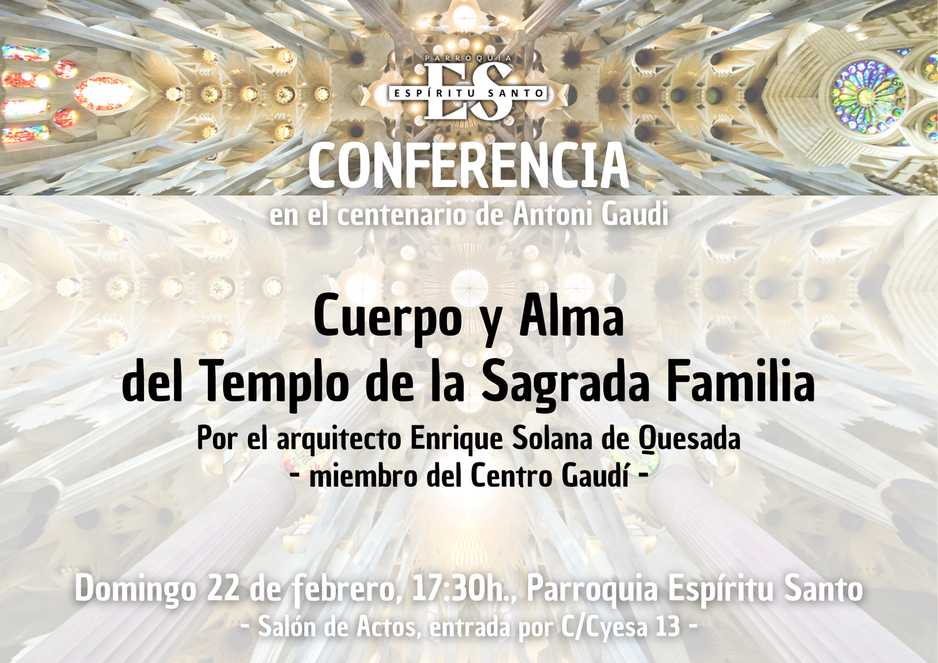 No te pierdas nuestra próxima conferencia sobre Gaudí y el templo expiatorio de la Sagrada Familia. Un tema muy de actualidad al celebrarse el centenario del genial arquitecto y su más que posible beatificación este verano. De la mano de D. Enrique Solana (arquitecto, miembro del Centro Gaudí) descubriremos la intención del gran templo barcelonés y la intención de su arquitecto: utilizar la belleza y técnica para expiar, alabar y anunciar a Dios. Será el domingo 22 de febrero a las 17:30h. en el Salón de Actos de la Parroquia Espíritu Santo (C/Cyesa 13). Empezaremos con un pequeño café y rato de acogida desde las 17.30; y unos 20 o 25 minutos después empezará la conferencia.