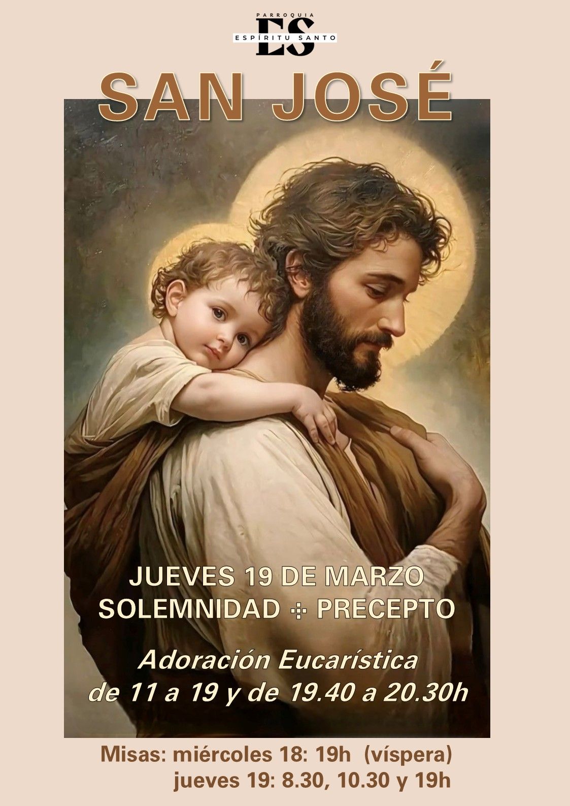 El próximo jueves 19 de marzo se celebra la solemnidad (de precepto) de " San José, esposo de la Virgen María ". Alabamos y agradecemos a Dios las maravillas realizadas en la vocación y la respuesta de san José: esposo de la Virgen María, padre putativo de Jesús, patrono y protector de la Iglesia, de la familia y los padres de familia, de los trabajadores especialmente los artesanos, y patrono de la buena muerte. Para profundizar en la figura de san José, te recomendamos especialmente leer la sencilla carta apostólica " Patris Corde ", que escribió el Papa Francisco para el año de San José (2020-1); y si quieres profundizar más teológicamente en la importancia de José, acude a " Redemptoris Custos ", de san Juan Pablo II en 1989, sobre la figura y misión de san José en la vida de Jesús y en la de la Iglesia. En la parroquia celebramos esta fiesta en las misas habituales de un jueves, pues se trata de un día laborable a efectos civiles: 08.30, 10.30 y 19.00h. Además, al ser una fiesta tan importante, también se celebra en la víspera: miércoles 18 a las 19.00.h Recuerda que es día de precepto, pero si hay causa grave por las que no puedas acudir no es considerado una falta; así lo dice el catecismo: "Los fieles están obligados a participar en la Eucaristía los días de precepto, a no ser que estén excusados por una razón seria (por ejemplo, enfermedad, el cuidado de niños pequeños...) o dispensados por su pastor propio. Los que deliberadamente faltan a esta obligación cometen un pecado grave.” ( CIC 2181 )
