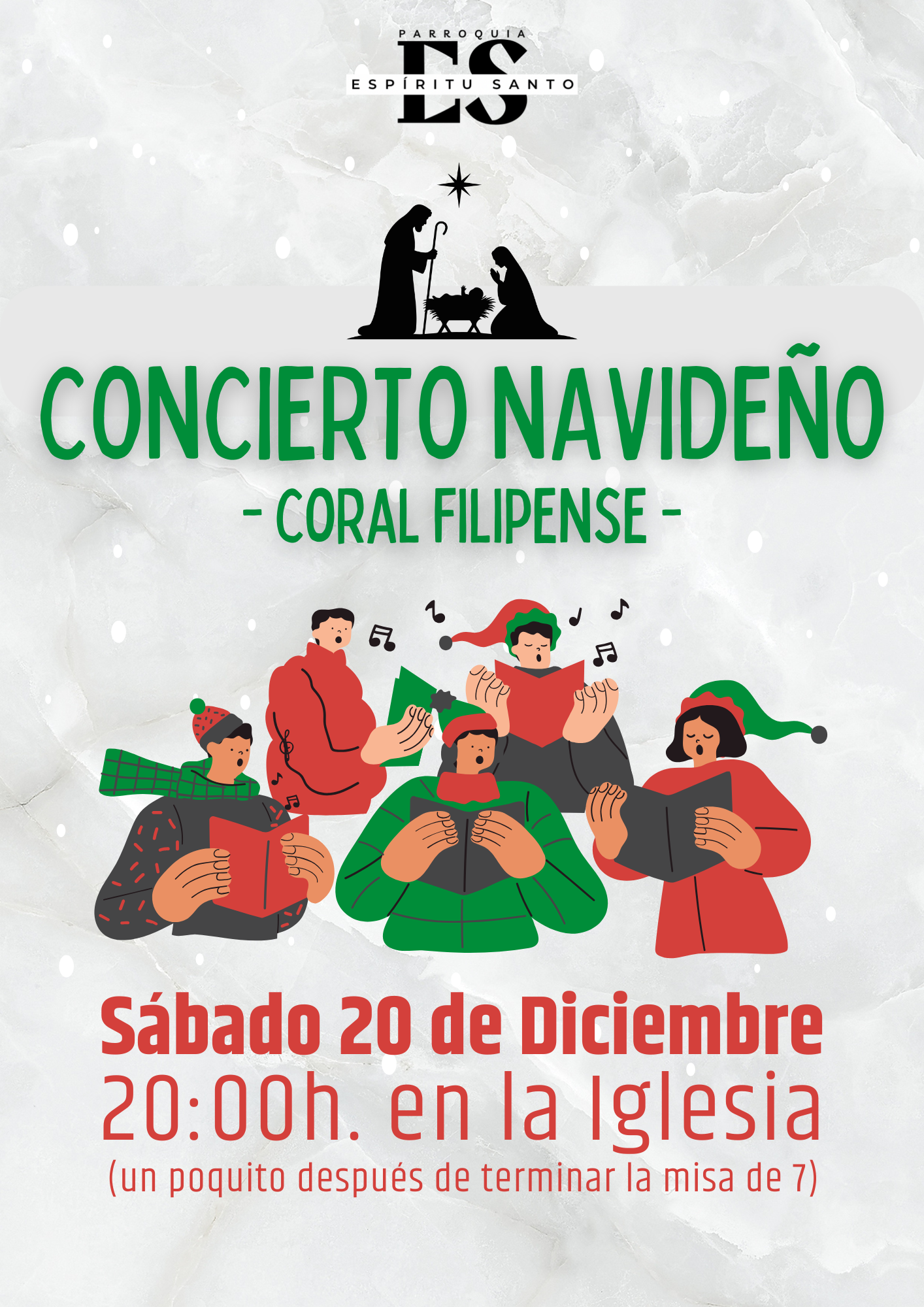 Este sábado 20 de diciembre a las 20:00h., en la Iglesia, (un poquito después de la misa de las 7) podremos disfrutar del tradicional concierto navideño que todos los años nos ofrece la coral del colegio de las Filipenses. Ven a disfrutar de un rato de música en directo y a dejarte contagiar de la belleza entrañable de los cantos tradicionales de Navidad. Este sábado 20 a las 20h.