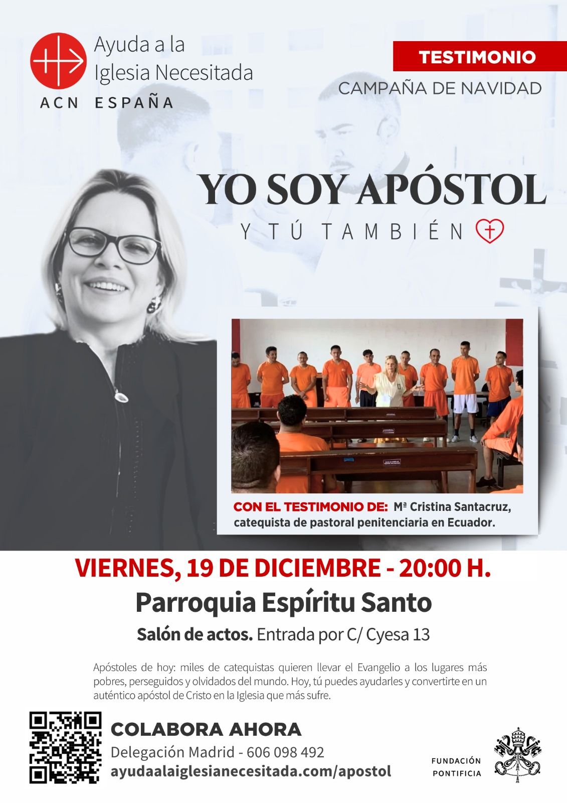 El próximo viernes 19 de diciembre a las 19.40h. (un poquito después de terminar la misa de las 19h.) te esperamos en el Salón de Actos de la Parroquia (C/Cyesa 13) para escuchar el testimonio de Dña. MªCristina Santacruz, catequista de la pastoral penitenciaria en Ecuador. El testimonio está organizado por "Ayuda a la Iglesia Necesitada" y quiere ayudarnos a descubrir a los "apóstoles de hoy": esos que llevan el evangelio a los lugares más pobres, perseguidos y olvidados del mundo. No te lo pierdas: viernes 19 a las 19.40h. Empezaremos con un pequeño momento de acogida y merienda y, a las 20.00h., comenzará el testimonio.
