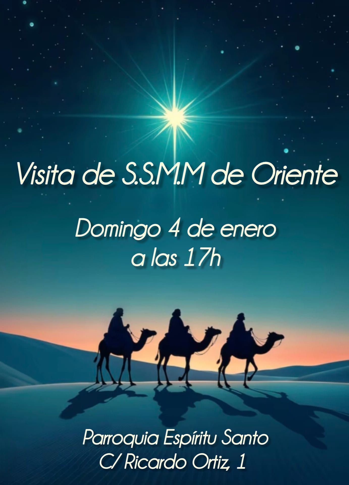 Visita de los Magos a la Parroquia El próximo domingo 4 de enero a las 17:00h. esperamos la visita de sus majestades los Reyes Magos de Oriente a la Parroquia. Vendrán para adorar al niño Jesús y pasar un rato con las familias de la parroquia. Será una tarde de ilusión y alegría para todos los niños del barrio, no os lo perdáis. Cabalgata de Reyes en La Elipa Mágicamente esa misma tarde los Magos participarán en la Cabalgata de nuestro barrio. Empezará el domingo 4 a las 17.30h. cerca del dragón de la Elipa (principio de Avda.Marqués de Corvera) y subirá hasta la C/Francisco Villaespesa que recorrerá entera junto con parte de la C/Ascao, allí girará para ir por la C/Emilio Ferrari hasta la C/Alcalá, que recorrerá hasta llegar a la Junta del Distrito de Ciudad Lineal (C/Hermanos García Noblejas 16). Acogida de los Magos en la Catedral El día anterior, el sábado 3 de enero, a partir de las 17:00h., los Reyes Magos estarán en la Catedral de la Almudena para encontrarse con los niños y sus familias, y adorar al niño Jesús.