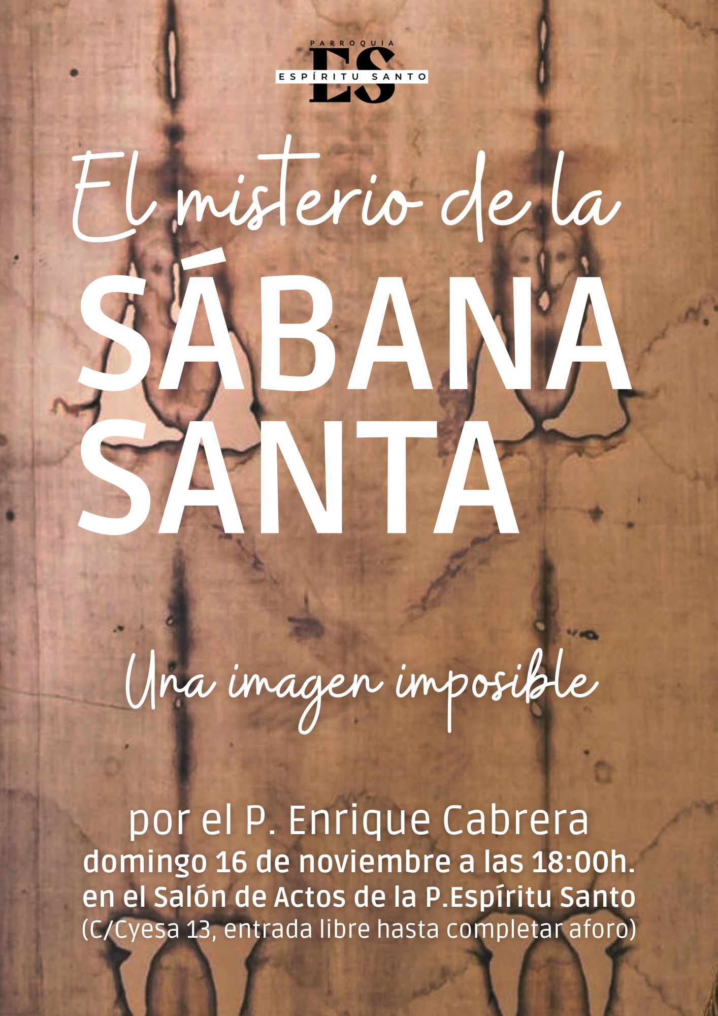 El próximo domingo 16 de noviembre a las 18.00h., en el Salón de Actos parroquial, tendremos una conferencia sobre el misterio de la Sábana Santa. Uno de los objetos históricos más investigados por la ciencia y la historia y que, sin embargo, sigue siendo un misterio. Estará a cargo del padre Enrique Cabrera , experto en sindonología, que con su estilo cercano y ameno, y apoyado en imágenes, intentará adentrarnos en el misterio de esta imagen imposible. Invita a quien quieras, no te lo pierdas: el domingo 16 a las 18h.