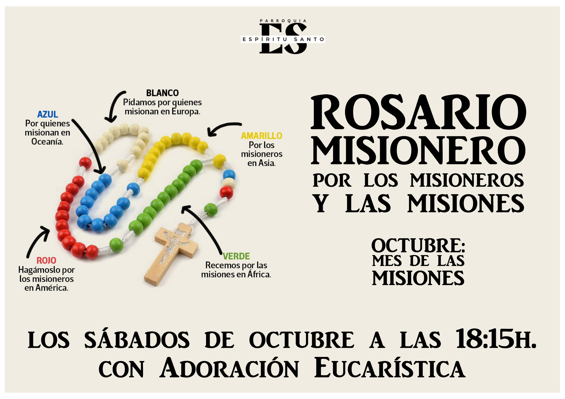 En octubre, con ocasión del DOMUND (domingo 19), se celebra el "mes de las misiones". Por eso, como es costumbre en nuestra parroquia, cada sábado de este mes, organizamos en "Rosario por las misiones y los misioneros" los sábados de octubre a las 18.15h.: días 4, 11, 18 y 25.