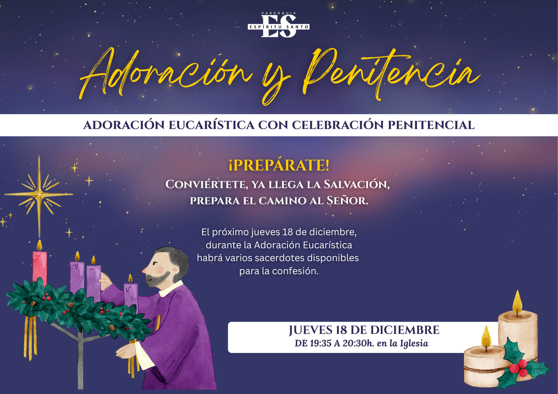 Ya llegamos al ecuador del Adviento, ya se siente más cercano el día en que se cumplirán las promesas del Señor: Él volverá, triunfante, sobre las nubes del cielo, para dar comienzo al cielo nuevo y la tierra nueva. Mientras llega ese momento -que no sabemos cuándo será- aprovechamos el tiempo de Adviento para estar preparados y listos a recibirle, al mismo tiempo que celebramos que ya vino, como humilde niño, en Belén. Así que, para ayudar a preparar el alma a la venida del Señor, te invitamos a confesarte: hacer examen de conciencia, dolerte de tus pecados y, arrepentido, volverte al Señor y emprender de nuevo el camino hasta que Él vuelva. Puedes confesarte siempre que quieras, pero te ofrecemos hacerlo, con todos, este próximo 18 de diciembre entre las 19.35 y las 20.30h., durante la Adoración Eucarística de los jueves.
