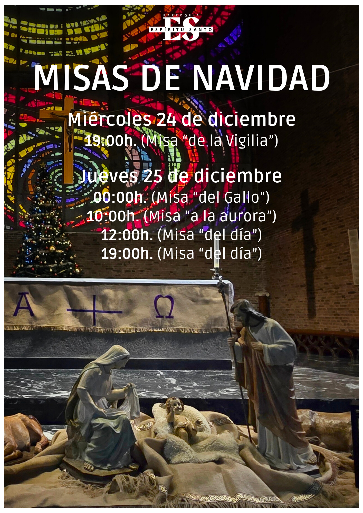 Ya casi estamos en Navidad, y te anunciamos ya los horarios de las celebraciones litúrgicas de precepto, para que no te pierdas nada (recuerda que aún nos quedan unos días de Adviento y que en este otro artículo tienes los horarios y actividades) . 25 de diciembre: Natividad del Señor MISAS: miércoles 24 a las 19h.; y jueves 25 a las 00 ("misa del gallo"), 10, 12, y 19h. (NO hay misas a las 11.30 ni a las 13.00h.: nos juntamos todos en la de las 12.00h.) 28 de diciembre: Domingo de la Sagrada Familia MISAS: sábado 27 a las 19h.; domingo 28 a las 10, 11.30, 13 y 19h. 1 de enero: Santa María, Madre de Dios MISAS: miércoles a las 19h.; jueves 1 a las 10, 12, y 19h. (NO hay misas a las 11.30 ni a las 13.00h.: nos juntamos todos en la de las 12.00h.) 4 de enero: Domingo 2º de navidad MISAS: sábado 3 a las 19h.; domingo 4 a las 10, 11.30, 13 y 19h. 6 de enero, martes: Epifanía del Señor MISAS: lunes 5 a las 19h.; martes 6 a las 10, 11.30, 13 y 19h. - 11 de enero: Domingo del Bautismo del Señor MISAS: sábado 10 a las 19h.; domingo 11 a las 10, 11.30, 13 (con bautizos) y 19h.
