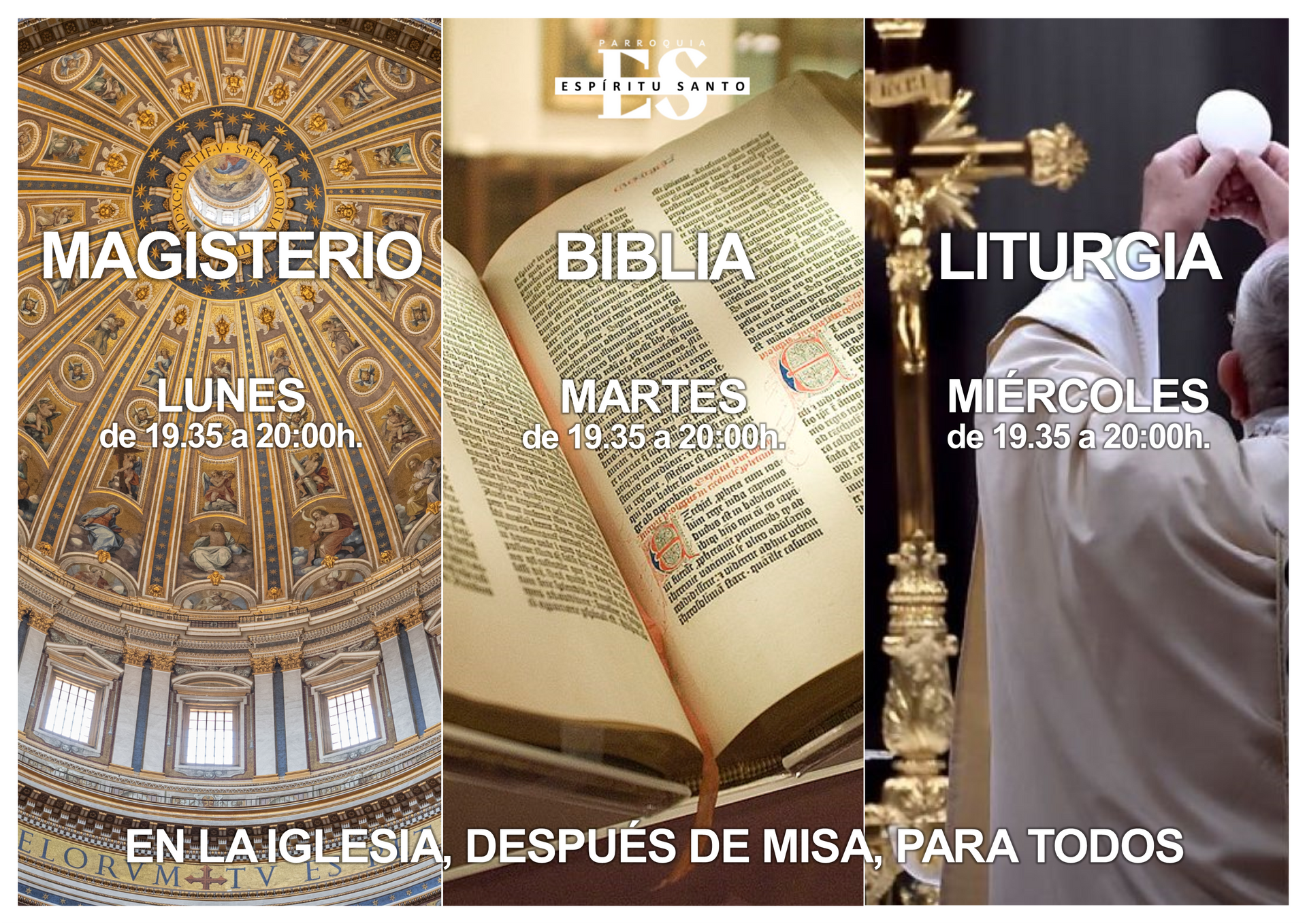Todos estáis invitados a seguir formándoos en la fe con las catequesis que ofrece la parroquia, para todos, después de la misa de 19h. los lunes, martes y miércoles: LUNES: Magisterio (Hno. Pedro) MARTES: Biblia (D. Alberto) MIÉRCOLES: Liturgia (D. Abraham) Serán charlas breves, de unos 20 minutos, directas y prácticas, Merecerán la pena, no os lo perdáis.