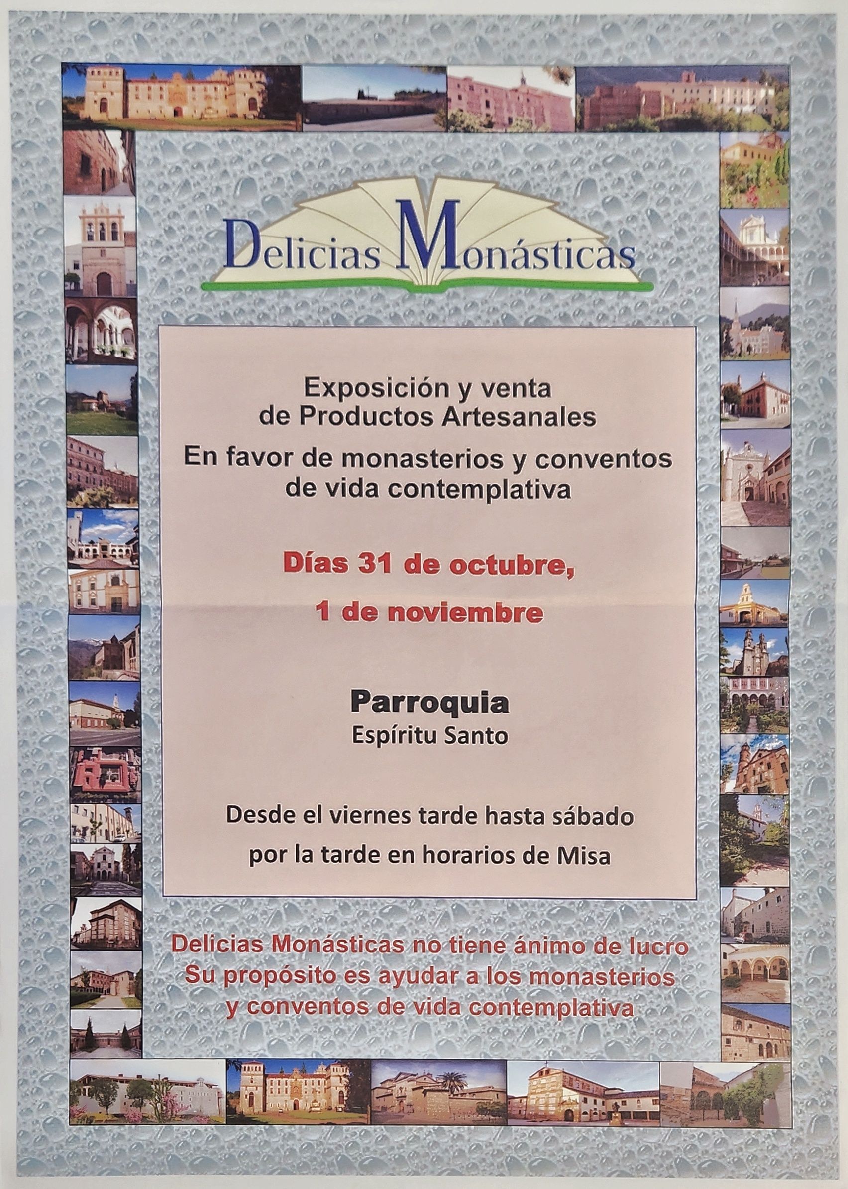 El próximo fin de semana de "Todos los Santos" habrá, a la entrada de la parroquia, una pequeña exposición de productos monásticos que podremos comprar para ayudar al sostenimiento de algunas comunidades contemplativas de la Iglesia. Lo organiza " Delicias Monásticas ", un proyecto privado, sin ánimo de lucro, al servicio de monasterios y conventos de vida contemplativa, para ayudar a su sostenimiento. Tienen una tienda online en el que puedes comprar productos de todo tipo y para cualquier ocasión.